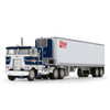 This authentic Peterbilt® 352 COE Sleeper Cab diecast metal replica model comes paired with a 40' Vintage Trailer with Reefer and features a tilting cab that reveals authentic engine detail, accurately detailed cab interior, poseable front wheels, pivoting fifth-wheel for trailer attachment, working trailer landing gear, opening rear doors, detailed chassis and undercarriage. This quality replica is decorated with a blueand white paint scheme. This 1/64 scale replica measures approximately 10.5" long, 1.75" wide, and 2.5" high.