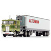 This authentic Peterbilt 352 COE 86" Sleeper Cab diecast metal replica model comes paired with a 40' Vintage Trailer with Reefer and features a tilting cab that reveals authentic engine detail, accurately detailed cab interior, poseable front wheels, pivoting fifth-wheel for trailer attachment, working trailer landing gear, opening rear doors, detailed chassis and undercarriage. This quality replica is decorated with a tan, green and white paint scheme. This 1/64 scale replica measures approximately 10.5" long, 1.75" wide, and 2.5" high.