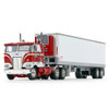 This authentic Peterbilt 352 COE 86" Sleeper Cab diecast metal replica model comes paired with a 40' Vintage Trailer with Reefer and features a tilting cab that reveals authentic engine detail, accurately detailed cab interior, poseable front wheels, pivoting fifth-wheel for trailer attachment, working trailer landing gear, opening rear doors, detailed chassis and undercarriage. This quality replica is decorated with a red and white paint scheme. This 1/64 scale replica measures approximately 10.5" long, 1.75" wide, and 2.5" high.