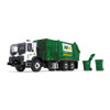 This authentic Mack® TerraPro® diecast metal replica model comes paired with a side load refuse body and features the tilt forward cab with authentic engine detail, accurately detailed cab interior, opening rear tailgate, and functioning side load trash cart tipper mechanism with two trash cart accessories. This quality replica is decorated with a green and white paint scheme with green trash carts. This 1/34 scale replica measures approximately 11.5" long, 3.5" wide, and 4.5" high.
